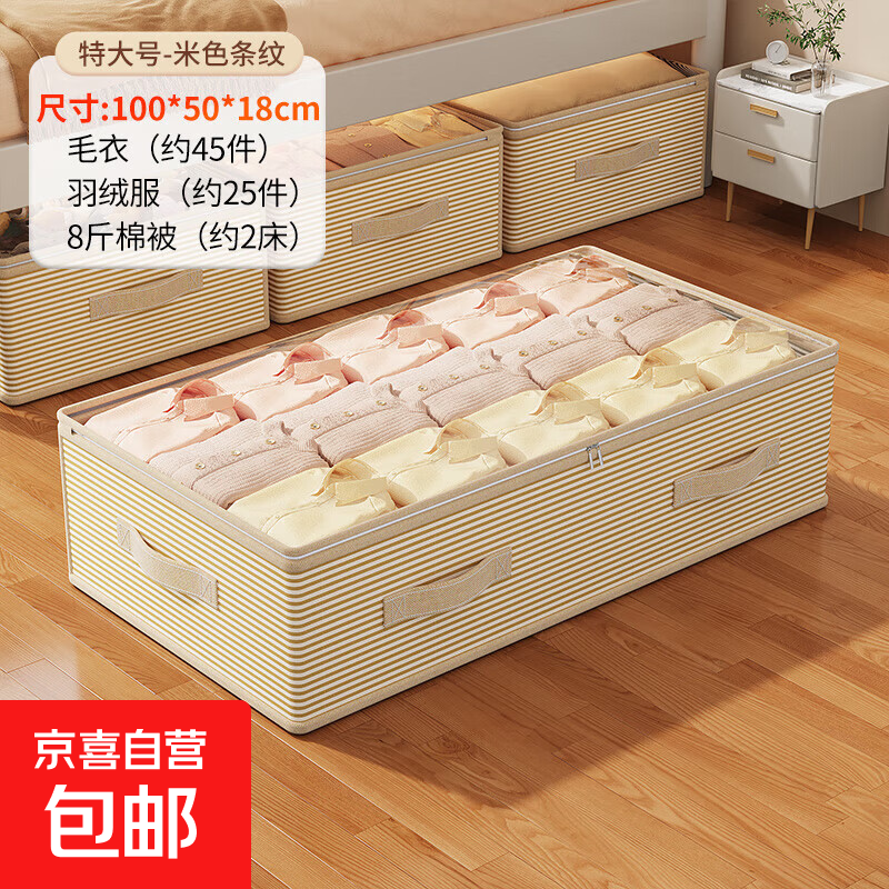 京东物流 床底布艺衣物收纳箱衣服收纳盒可折叠大号衣服整理箱 100*50*25cm 米色条纹 2个