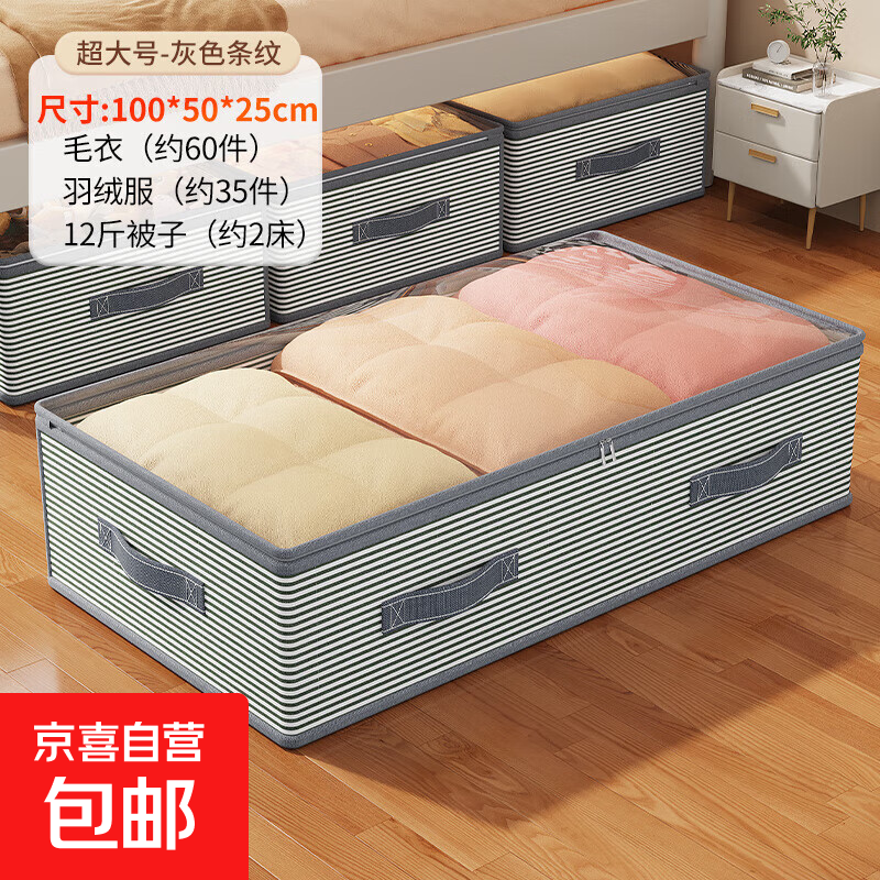 京东物流 床底布艺衣物收纳箱衣服收纳盒可折叠大号衣服整理箱 100*50*25cm 灰色条纹 2个