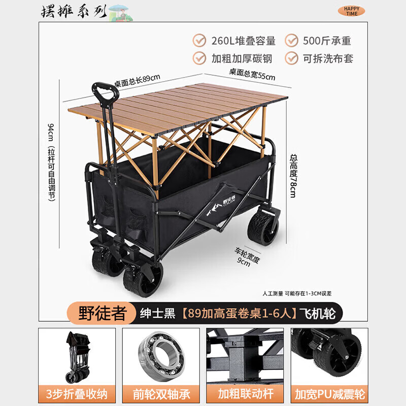 野徒者露营车户外推车野餐车儿童可躺露营装备折叠摆摊营地车小买菜车 曜石黑-16寸【飞机轮】+90桌子 升级加粗全钢车架