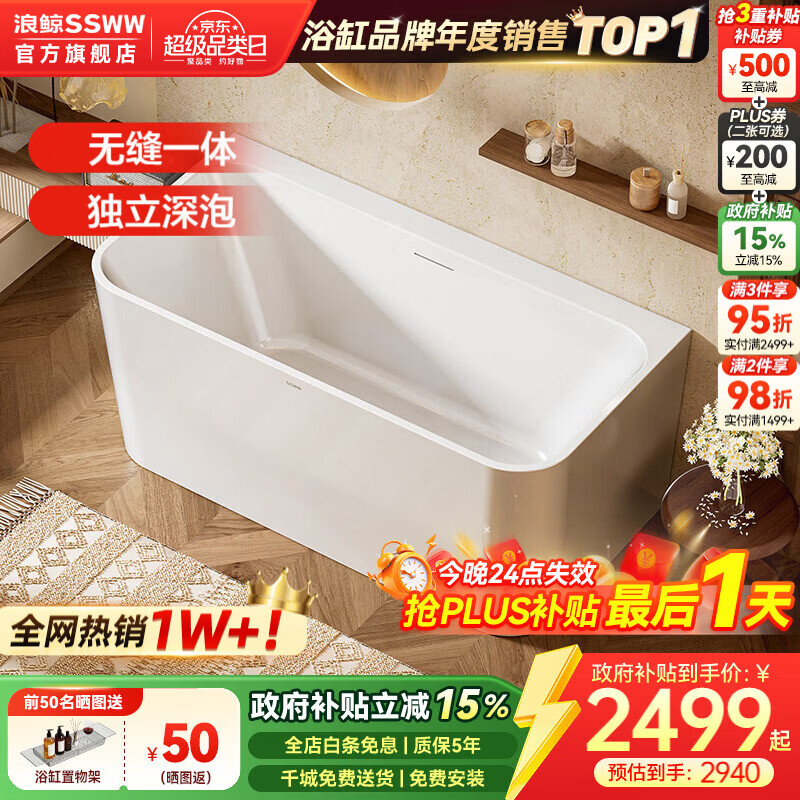 浪鲸(SSWW) 卫浴家用成人亚克力方形浴缸无缝一体泡澡浴缸含下水器0220鲸沐 【1.3m空缸】