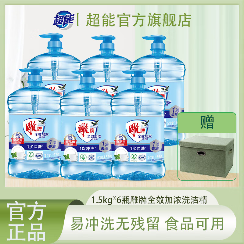 雕牌洗洁精家庭装家用大桶全效加浓强力洗涤剂厨房洗碗清洁剂实惠 【18斤】1.5kg*6瓶雕牌全效洗洁精+收纳盒