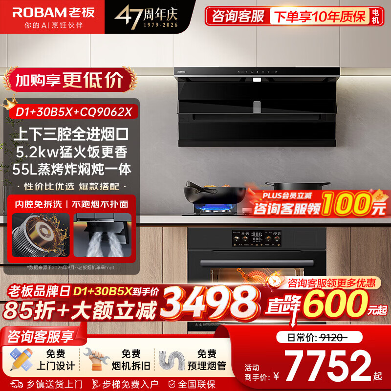 老板(Robam)【咨询客服价更低】小黑翼顶侧双吸油烟机灶具套装超薄平嵌家用大吸力7字型D1P青春版烟灶套装 【D1三件套】烟灶套装+蒸烤一体机CQ9062X