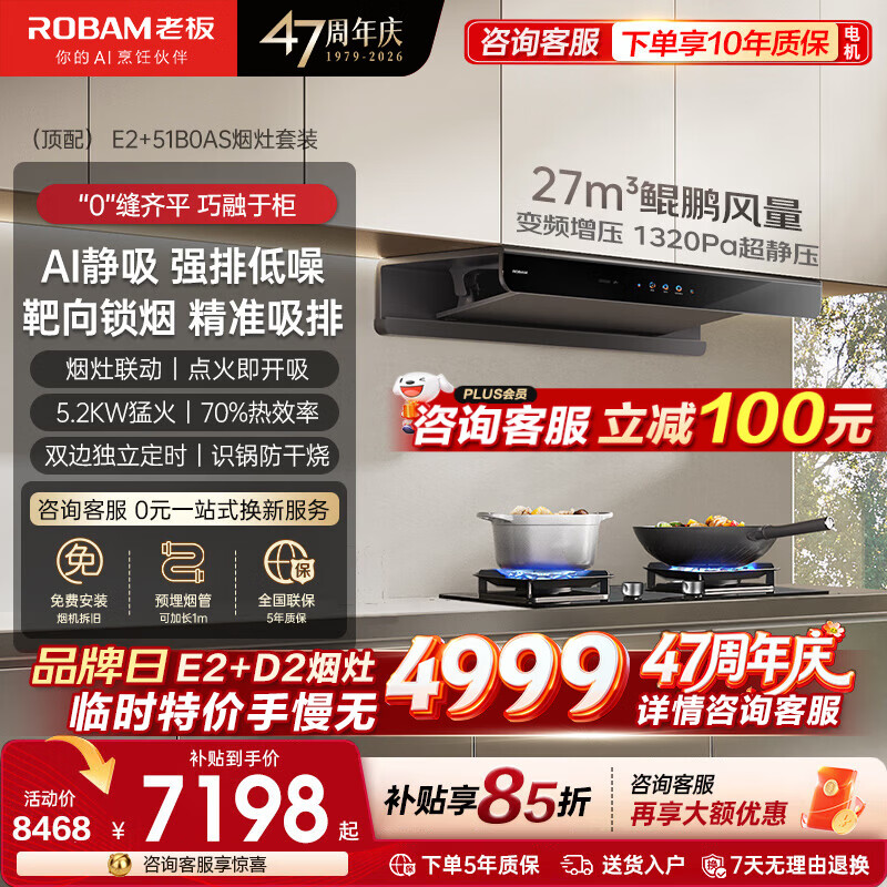 老板(Robam)【抢烟灶热6999】双子星E2机皇27风量欧式抽吸油烟机燃气灶具套装智能巡航增压1320Pa挥手智控 【顶配特价抢购】E2+51B0AS联动+防干烧+定时全能灶