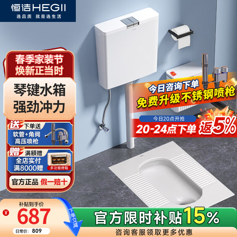 恒洁(HEGII)专利款蹲便器水箱套装超薄防溅防臭卫生间蹲便蹲坑蹲厕大便器3026 3026A蹲便器+6050琴键大冲力水箱套装