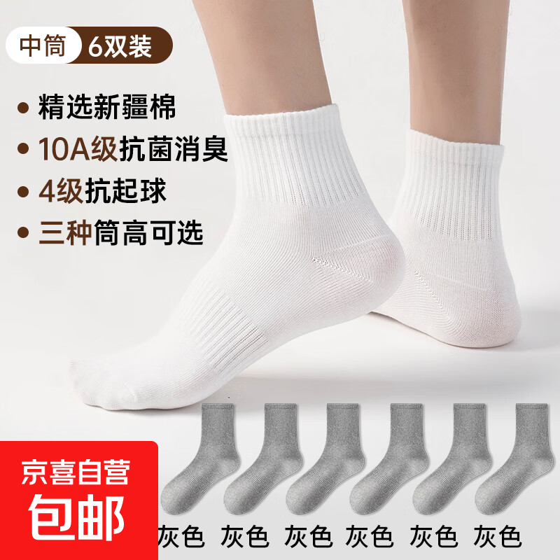 【10A抗菌】精梳棉抗起球袜子男防臭透气吸汗秋冬棉袜纯色中筒袜 【6双】灰色 中筒