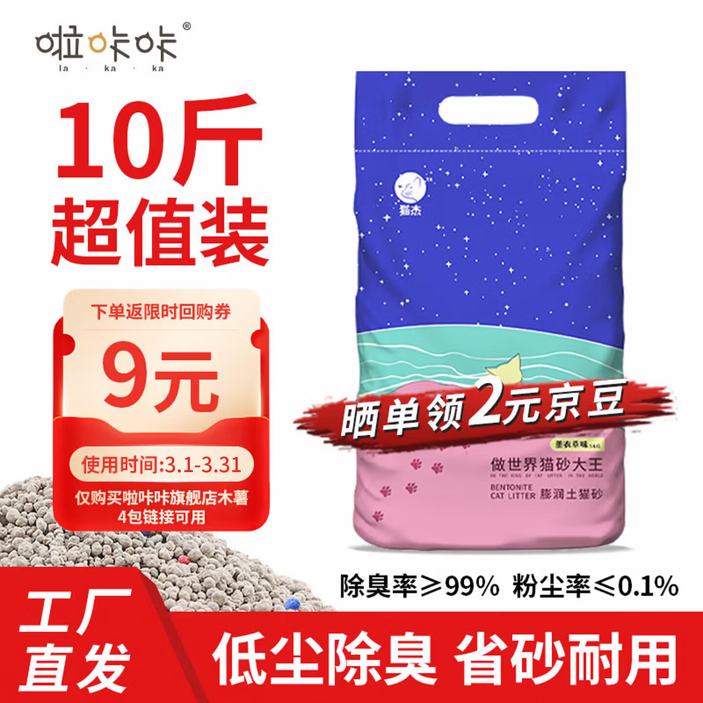 啦咔咔猫砂膨润土低尘除味结团猫砂猫咪用品几乎无尘猫砂 【猫杰】薰衣草10斤【工厂直发】