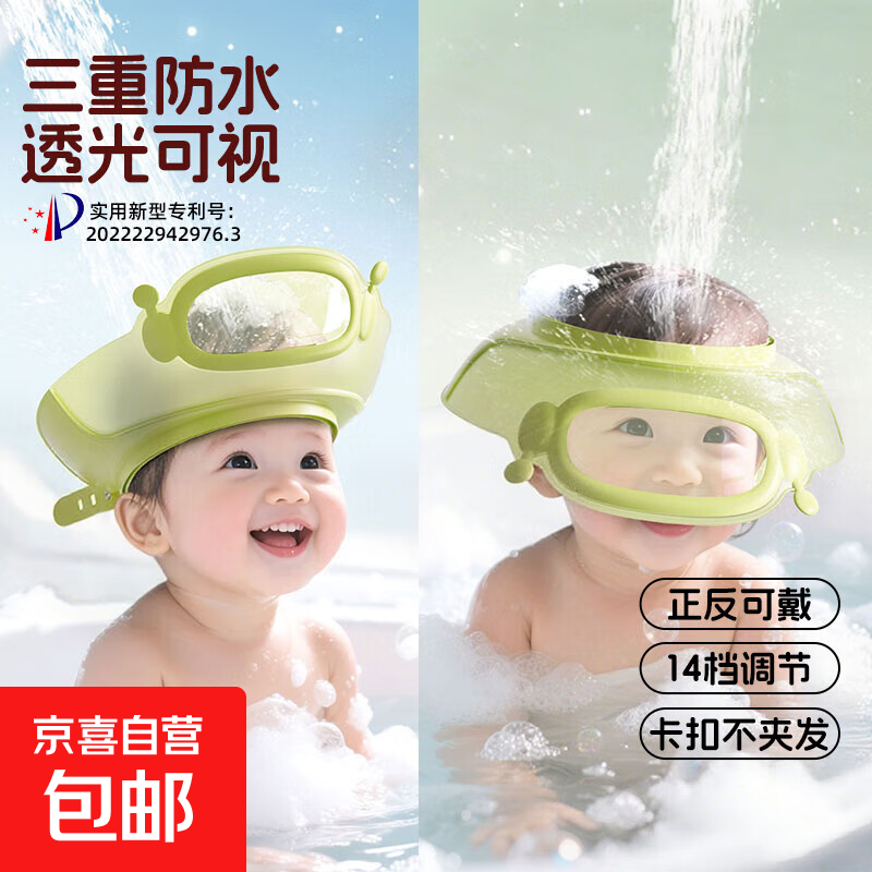 宝宝洗头帽防水儿童挡水浴帽婴儿洗发防水护耳可调节正反戴洗发帽 绿色