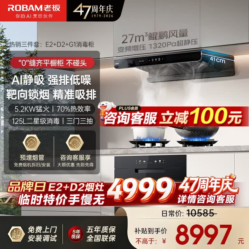 老板(Robam)【升级款E2+D2特价】抽吸油烟机燃气灶套装 家用欧式顶吸27风量吸力1320Pa静压 烟灶套装 一级能效 【三件套】烟灶套装+125L消毒柜G1