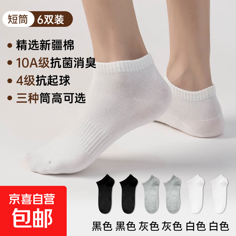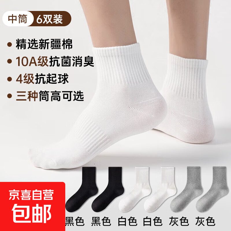 【10A抗菌】精梳棉抗起球袜子男防臭透气吸汗秋冬棉袜纯色中筒袜 【6双】黑*2+白*2+灰*2 短筒