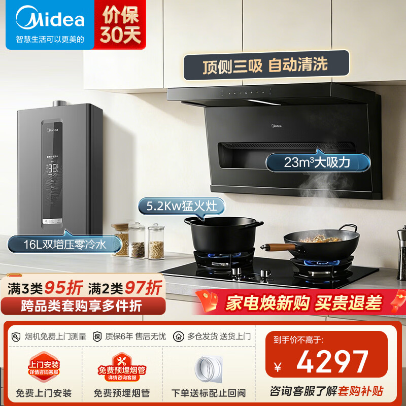 美的(Midea)顶侧三吸油烟机 23立方爆炒大吸力 7字型烟机自动清洗挥手智控家用抽油烟机炉灶燃气灶套装DP55 【烟灶热】配5.2KW灶QD52+16L双增压零冷水-天然气