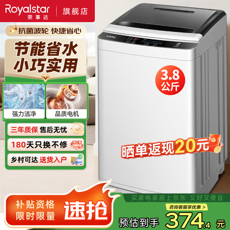 荣事达(Royalstar)8公斤全自动洗衣机大容量波轮家用租房节能省电一键脱水 3.8KG母婴专用【智能风干 节能省水】 波轮