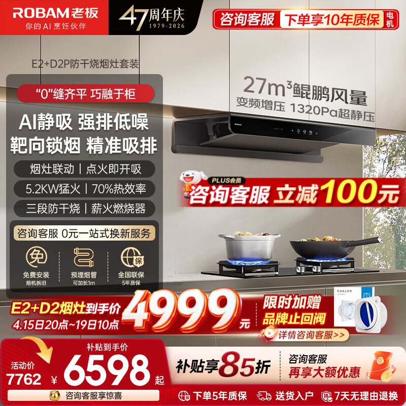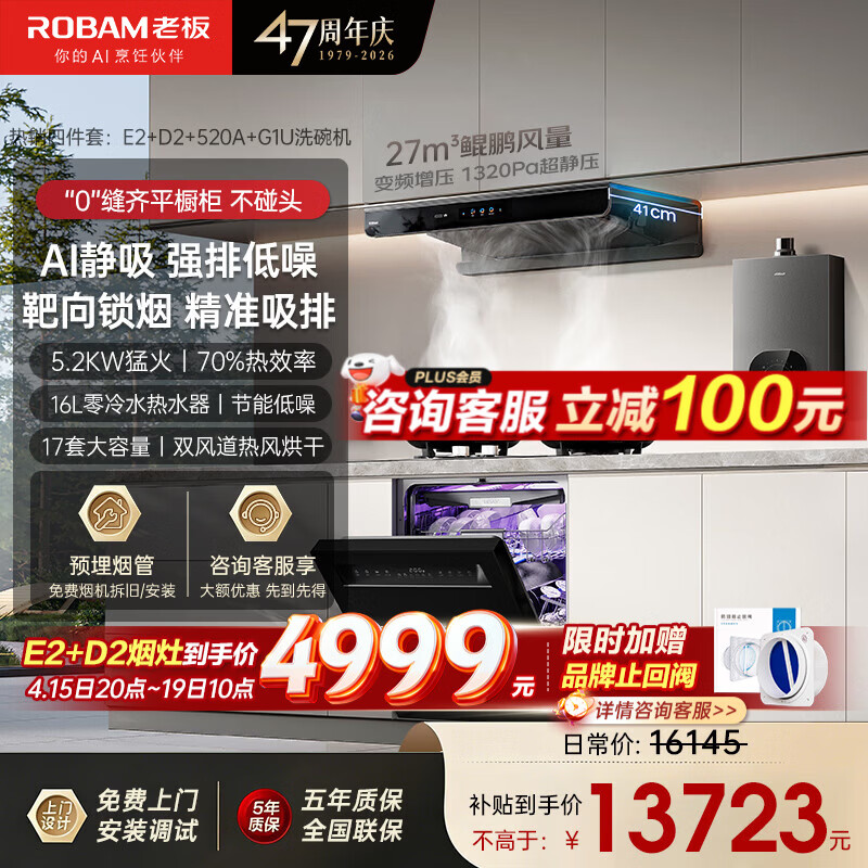 老板(Robam)【升级款E2+D2特价】抽吸油烟机燃气灶套装 家用欧式顶吸27风量吸力1320Pa静压 烟灶套装 一级能效 【四件套】烟灶热套装+150L洗碗机G1U