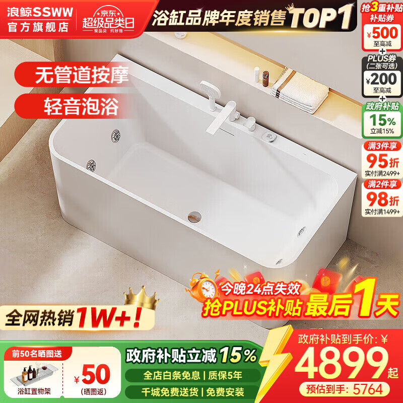浪鲸(SSWW) 卫浴家用成人亚克力方形浴缸无缝一体泡澡浴缸含下水器0220鲸沐 【1.2m无管道按摩缸】