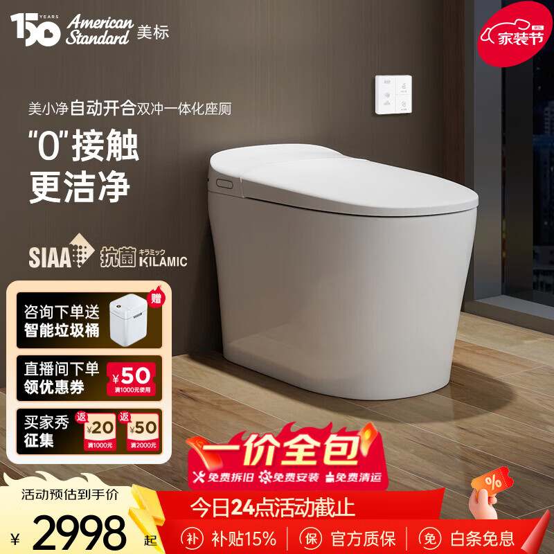 美标卫浴美小净轻智能马桶抗菌加热座圈脚踢免触自动开闭盖离座冲水 【升级款自动开合】美小净 305坑距 290-390mm适用