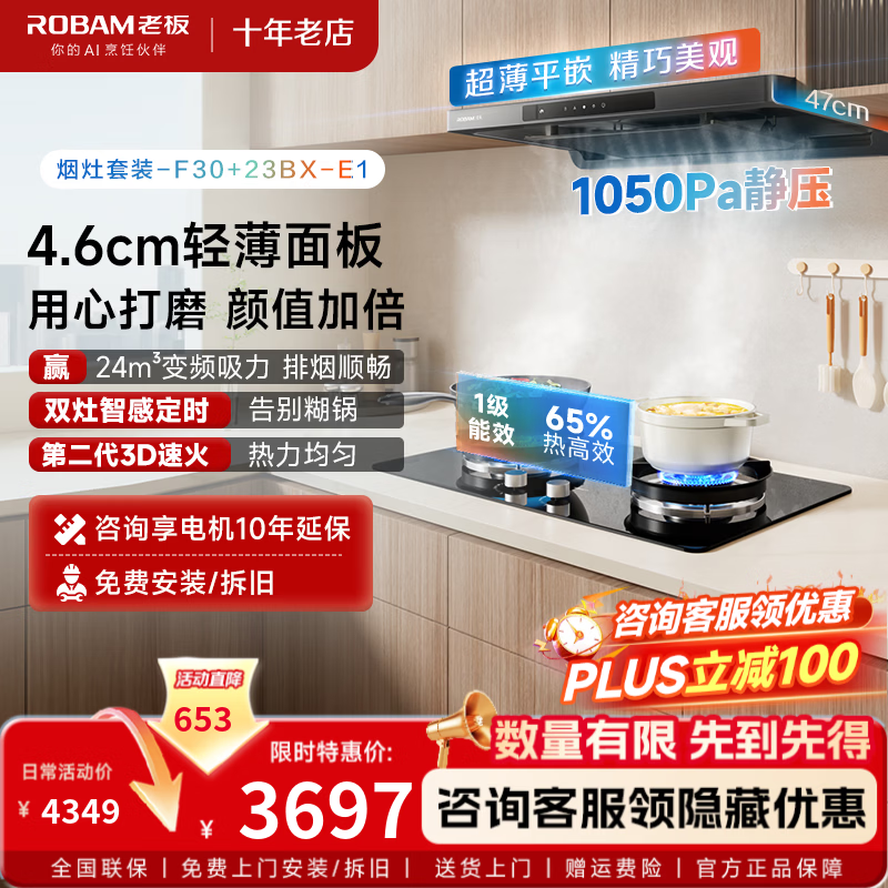 老板(Robam)【升级环吸大云板】F30油烟机灶具节能烟灶套装 厨房顶吸欧式24大风量 变频电机家用1050Pa大吸力 【双边定时套装】烟机F30+灶具23BX-E1