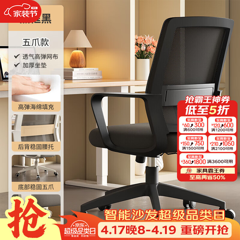 树浩电脑椅办公椅子舒适久坐靠背椅宿舍卧室学习座椅弓形电竞椅写字椅 【滑轮逍遥】海绵+尼龙脚-黑框黑