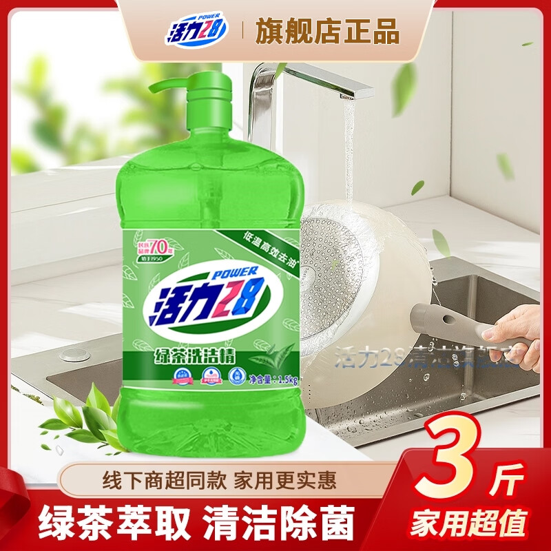 活力28洗洁精洗涤灵柠檬绿茶绿色安全可洗果蔬餐具净不伤手去油无残留 绿茶1.5kg*单瓶装