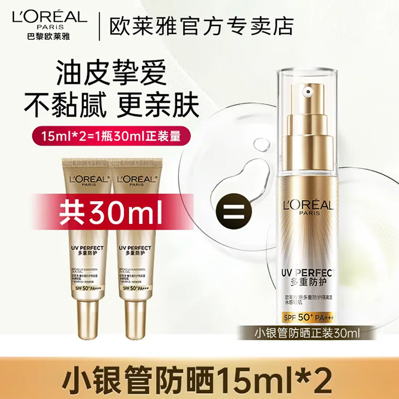 欧莱雅小金管防晒霜女士隔离霜二合一户外防晒乳护肤品防晒喷雾小银管 小银管防晒15ml*2瓶【出行推荐】