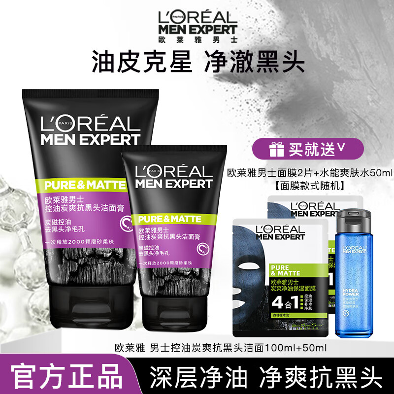 欧莱雅男士洗面奶补水保湿控油碳爽磨砂抗黑头深层净化氨基酸洁面膏乳 炭爽抗黑头洁面100ml+50ml+面膜