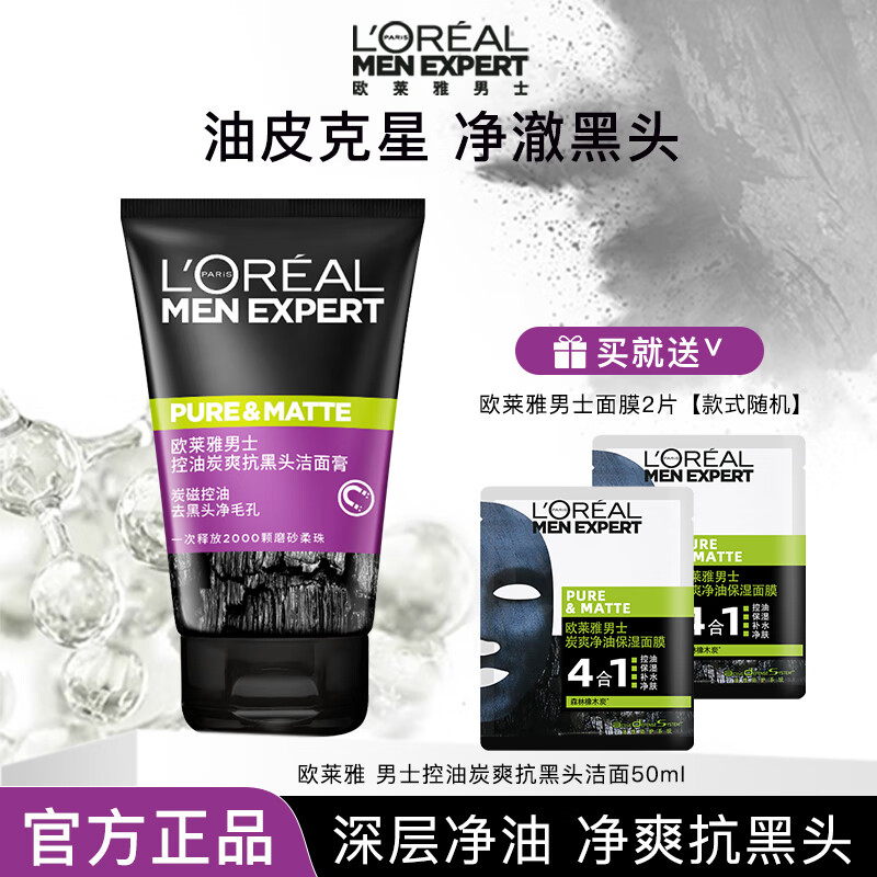 欧莱雅男士洗面奶补水保湿控油碳爽磨砂抗黑头深层净化氨基酸洁面膏乳 炭爽抗黑头洁面50ml+面膜2片
