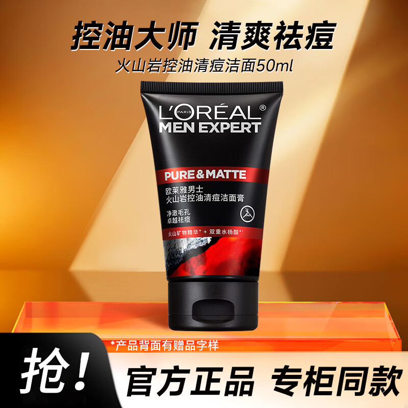 欧莱雅(LOREAL)男士洗面奶控油磨砂抗黑头深层清洁面乳男小巧户外便携 火山岩祛痘洁面 50ml
