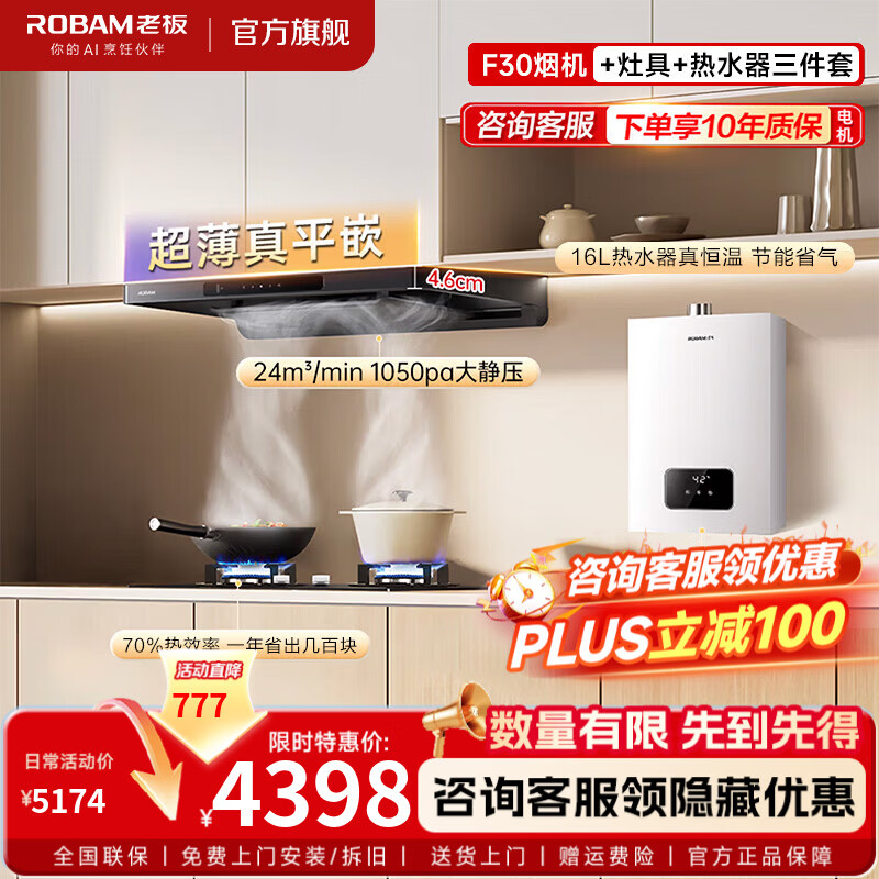 老板(Robam)【升级环吸大云板】F30油烟机灶具节能烟灶套装 厨房顶吸欧式24大风量 变频电机家用1050Pa大吸力 【烟灶热三件套】F30+2B0A2+热水器HT616A-16