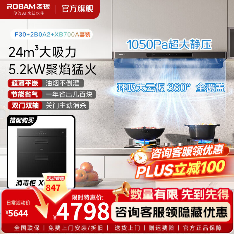 老板(Robam)【升级环吸大云板】F30油烟机灶具节能烟灶套装 厨房顶吸欧式24大风量 变频电机家用1050Pa大吸力 【烟灶消三件套】F30+2B0A2+消毒柜XB700A(D2mini)