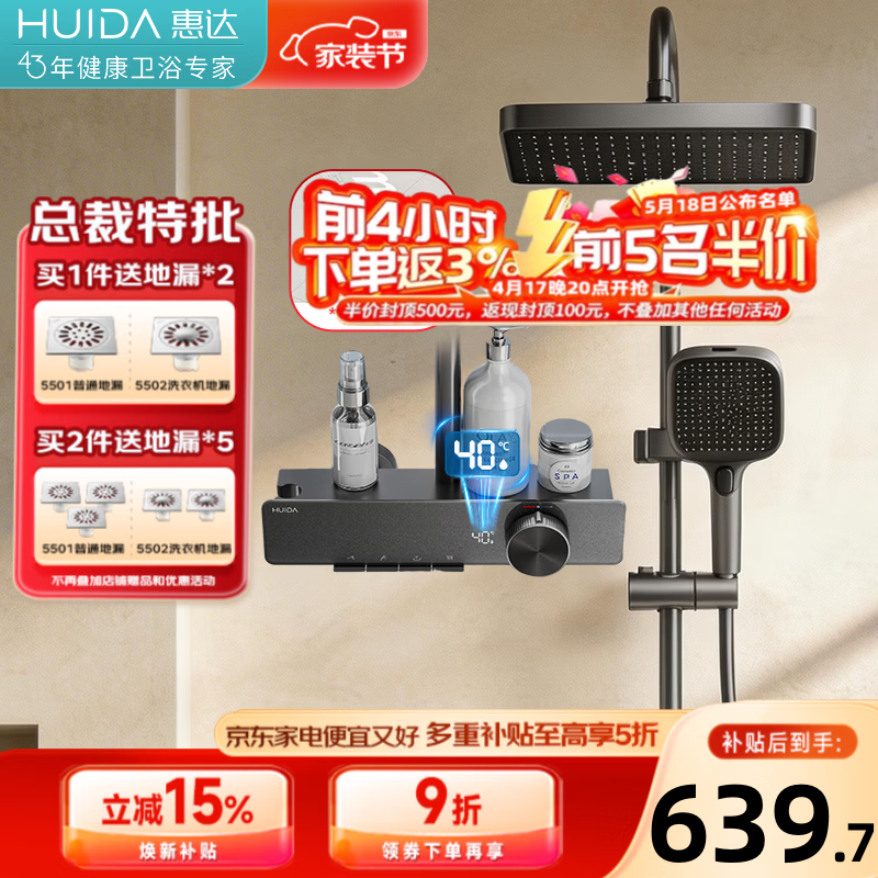 惠达卫浴淋浴花洒套装精铜主体增压花洒家用卫生间沐浴洗澡惠达花洒 【3月新品】智能数显琴键大顶喷大置物