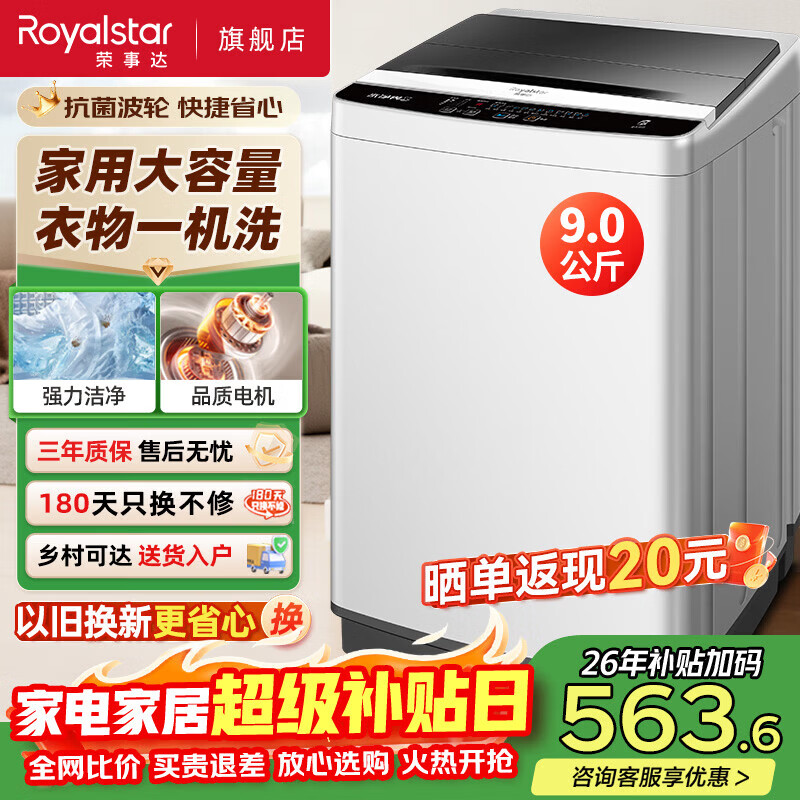 荣事达(Royalstar)8公斤全自动洗衣机大容量波轮家用租房节能省电一键脱水 9.0KG可洗四件套【智能风干 高效电机】 波轮