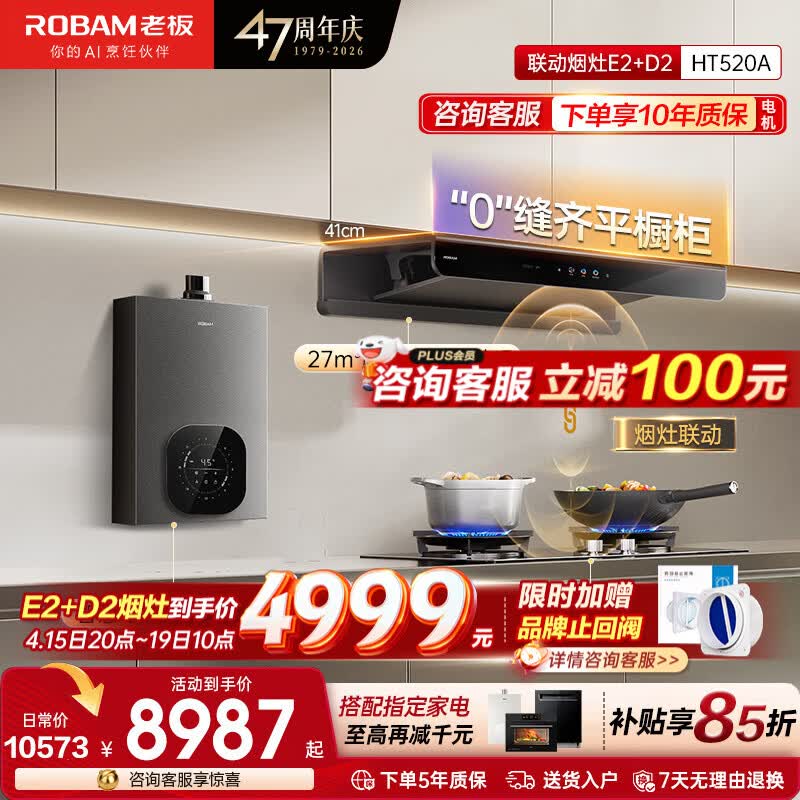 老板(Robam)【抢烟灶热6999】双子星E2机皇27风量欧式抽吸油烟机燃气灶具套装智能巡航增压1320Pa挥手智控 【限时6999三件套】烟灶+16L零冷水热水器