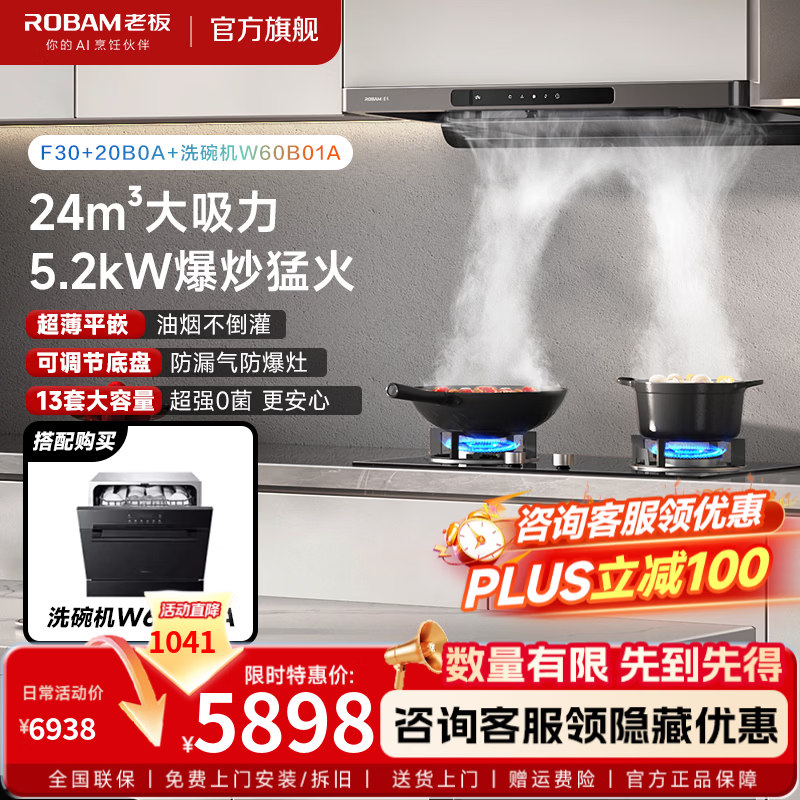 老板(Robam)【升级环吸大云板】F30油烟机灶具节能烟灶套装 厨房顶吸欧式24大风量 变频电机家用1050Pa大吸力 【烟灶洗三件套】F30+20B0A+洗碗机W60B01A