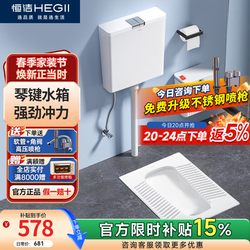 恒洁(HEGII)专利款蹲便器水箱套装超薄防溅防臭卫生间蹲便蹲坑蹲厕大便器3026 3027A蹲便器+6050琴键大冲力水箱套装
