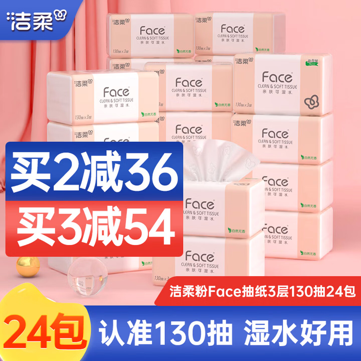 洁柔抽纸纸巾粉Face3层130抽可湿水婴儿纸巾家用餐巾纸面巾纸卫生纸 3层 130抽*24包 【共3120抽】