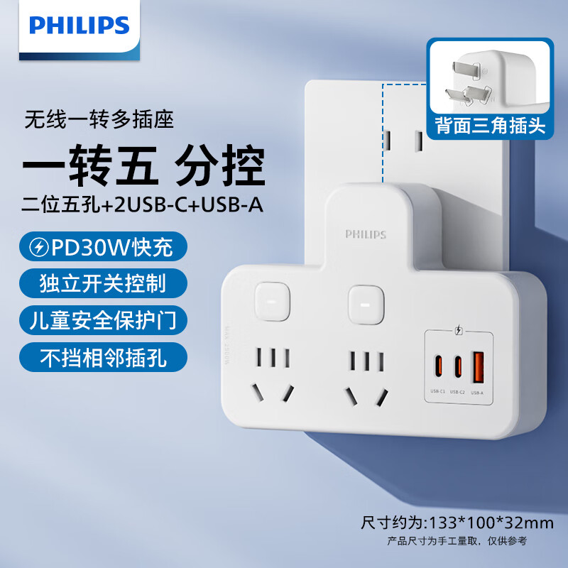 飞利浦(PHILIPS)插座转换器一转多扩展插头分控开关多功能家用电源转换头一转二插座一转三排插 插线板多用一拖二 【分控】一转二+2C1A(30w快充)