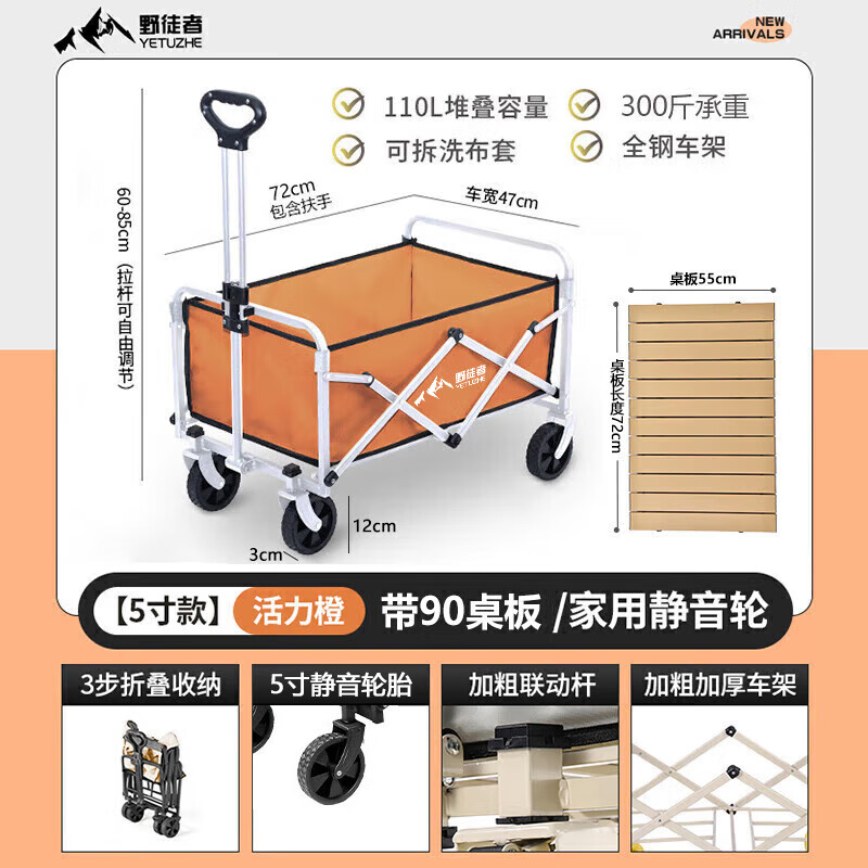 野徒者露营车户外推车野餐车儿童可躺露营装备折叠摆摊营地车小买菜车 活力橙-5寸万向轮+72桌板 升级加粗全钢车架