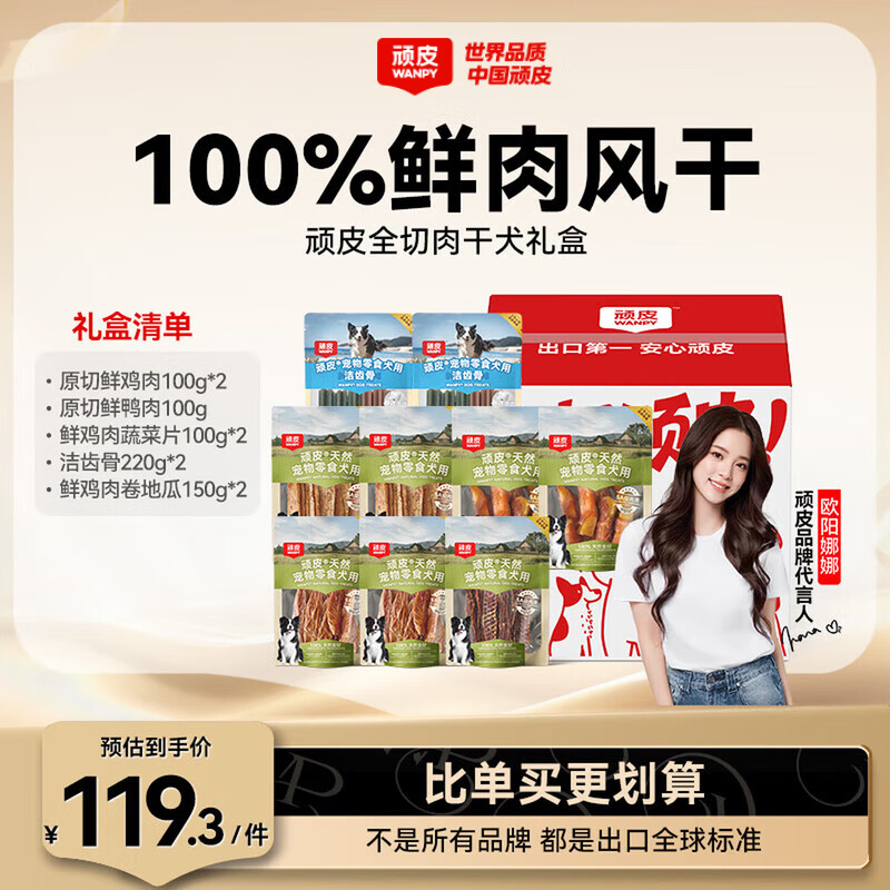 顽皮(Wanpy)果饭儿双拼犬粮添加鸡肉冻干拉布拉多比格宠物食品成犬幼犬专用 【限定】原切肉干礼盒(1240g)