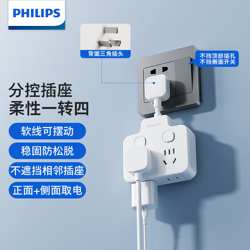 飞利浦(PHILIPS)插座转换器一转多扩展插头分控开关多功能家用电源转换头一转二插座一转三排插 插线板多用一拖二 【柔性分控】一转4插位