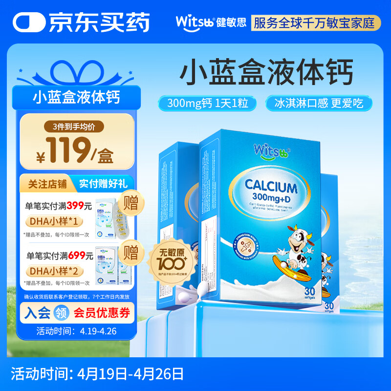 witsbb健敏思小蓝盒液体钙d3K2儿童6月+敏宝专研无敏原100+ 30粒*3盒