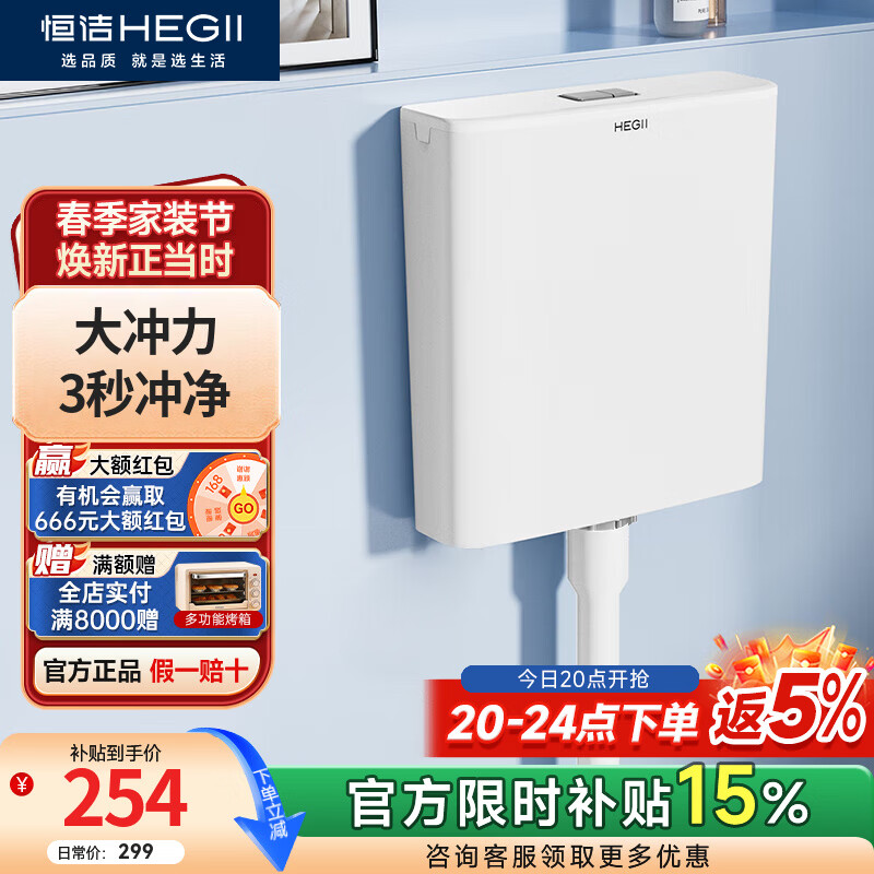 恒洁(HEGII)专利款蹲便器水箱套装超薄防溅防臭卫生间蹲便蹲坑蹲厕大便器3026 6030节水水箱(含角阀软管)