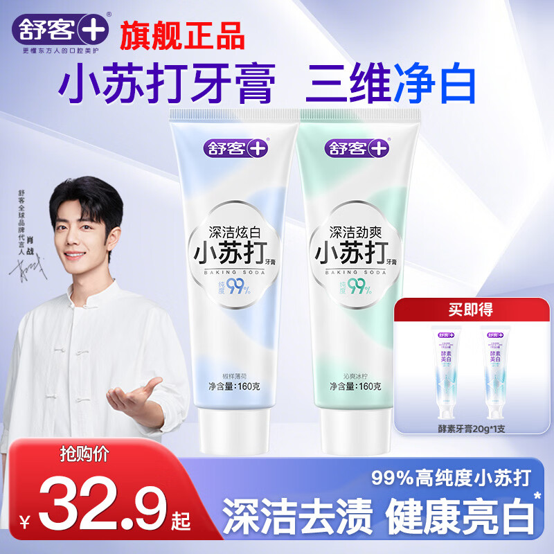 舒客小苏打牙膏美白清新口气臭牙齿炫白牙黄烟渍牙渍牙垢薄荷味 【炫白+劲爽】 160g*2支