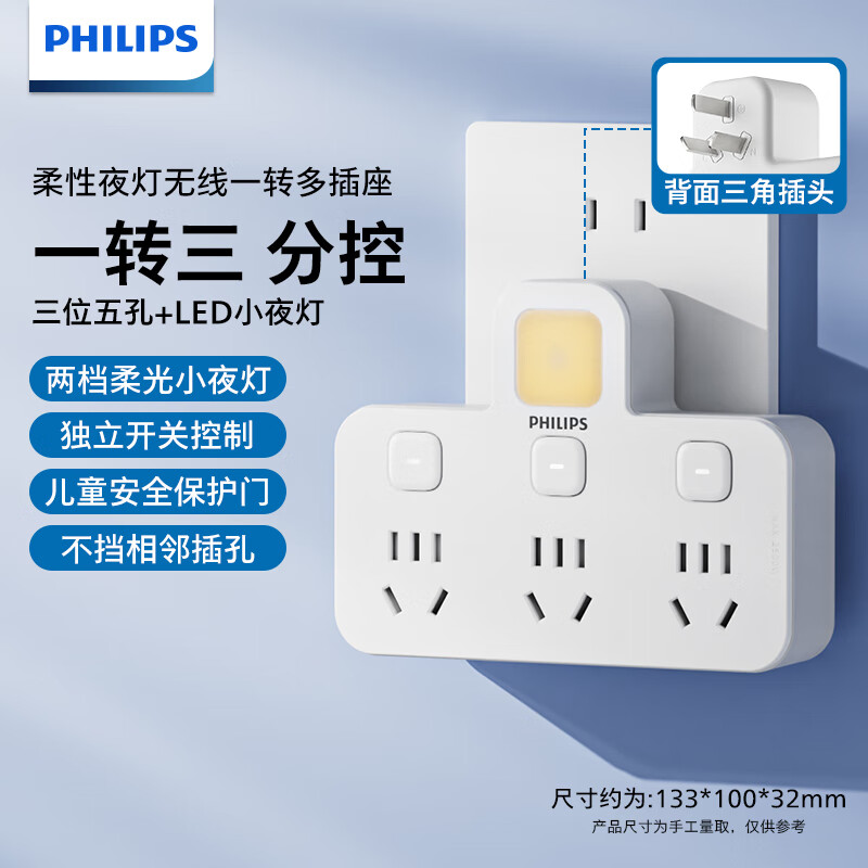 飞利浦(PHILIPS)插座转换器一转多扩展插头分控开关多功能家用电源转换头一转二插座一转三排插 插线板多用一拖二 【小夜灯】分控一转三
