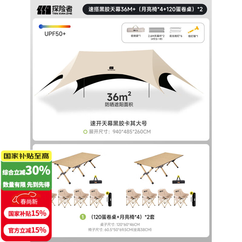 探险者(TAN XIAN ZHE)天幕帐篷户外露营车载便携六角防晒速开懒人天幕野营遮光遮阳棚 速搭黑胶天幕36㎡+月亮椅套装