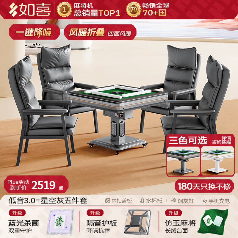 如喜【防侧翻20万次不卡牌】麻将机全自动餐桌低音家两用一体折叠电动 58【沙发椅】低音3.0一键降噪-仿玉-风暖-灰(三色可选) 请联系客服选择麻将牌大小