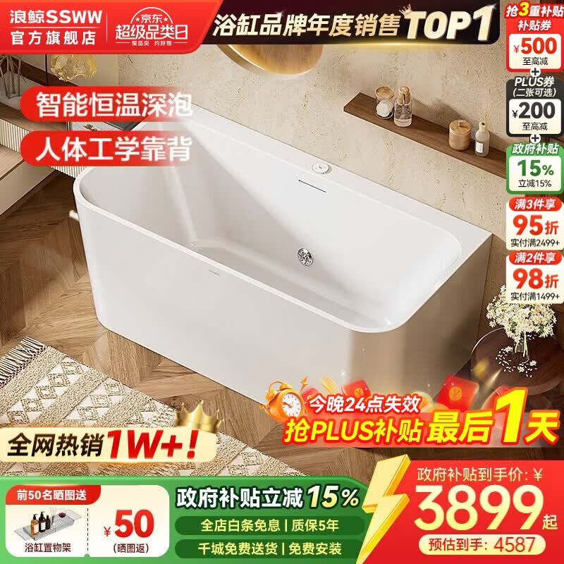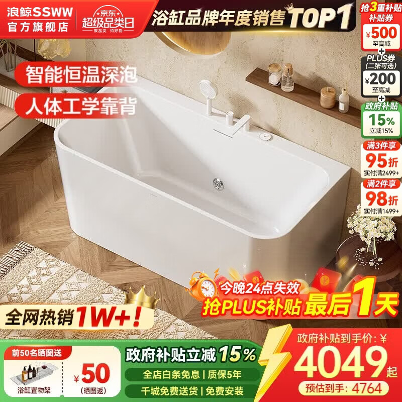 浪鲸(SSWW) 卫浴家用成人亚克力方形浴缸无缝一体泡澡浴缸含下水器0220鲸沐 【1.2m配件缸】配恒温款-定制周期约30天