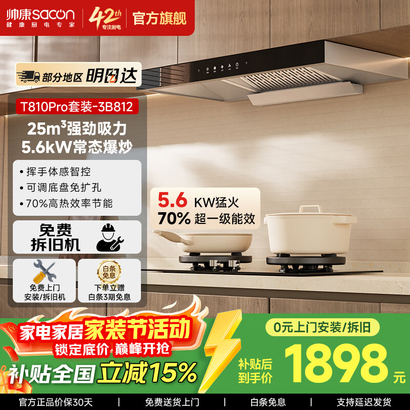 帅康(Sacon)【净界Pro】欧式顶吸式抽油烟机T810Pro T8233Pro 【特价爆款】25m³大吸力 以旧换新挥手智控 净界Pro套装-5.6kW炊烟灶(3B812)