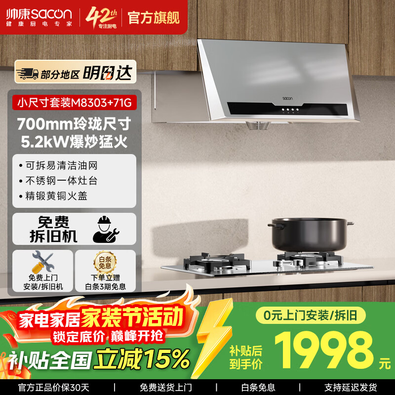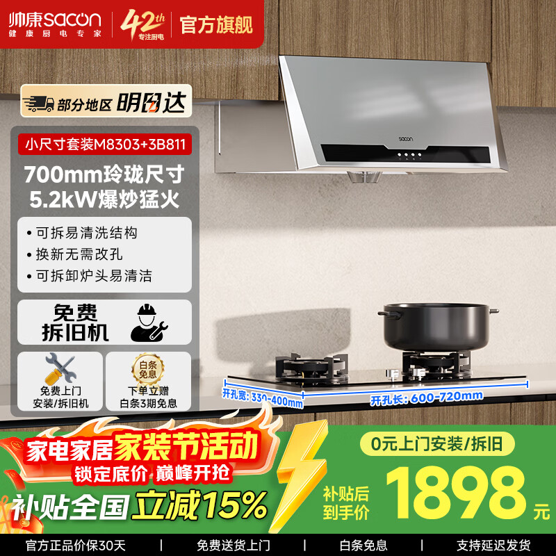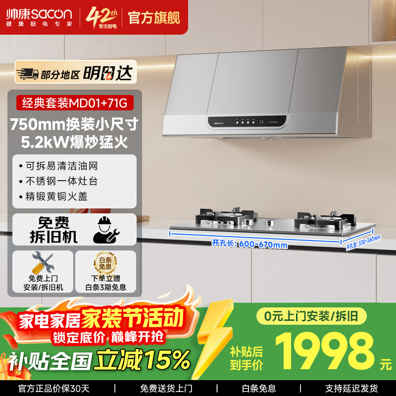 帅康(Sacon)中式抽油烟机MD01 M8303【畅销口碑款】750mm小尺寸上门安装以旧换新经典老式脱排吸油烟机 MD01套装D-5.2kW不锈钢面板(71G)