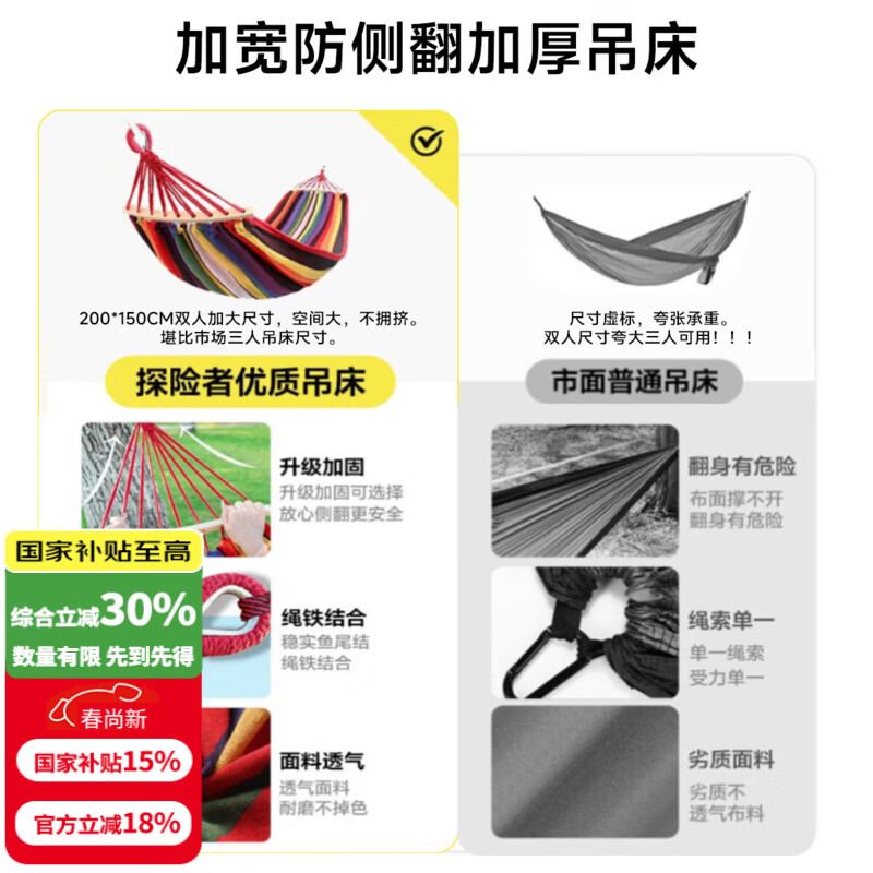 探险者(TAN XIAN ZHE)吊床户外秋千室内单人吊床双人吊床加宽加厚帆布秋千宿舍吊床 以下是加宽防侧翻加厚吊床