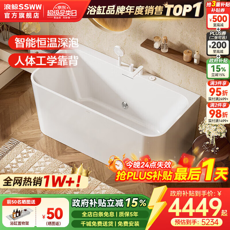 浪鲸(SSWW) 卫浴家用成人亚克力方形浴缸无缝一体泡澡浴缸含下水器0220鲸沐 【1.5m配件缸】配恒温款-定制周期约30天