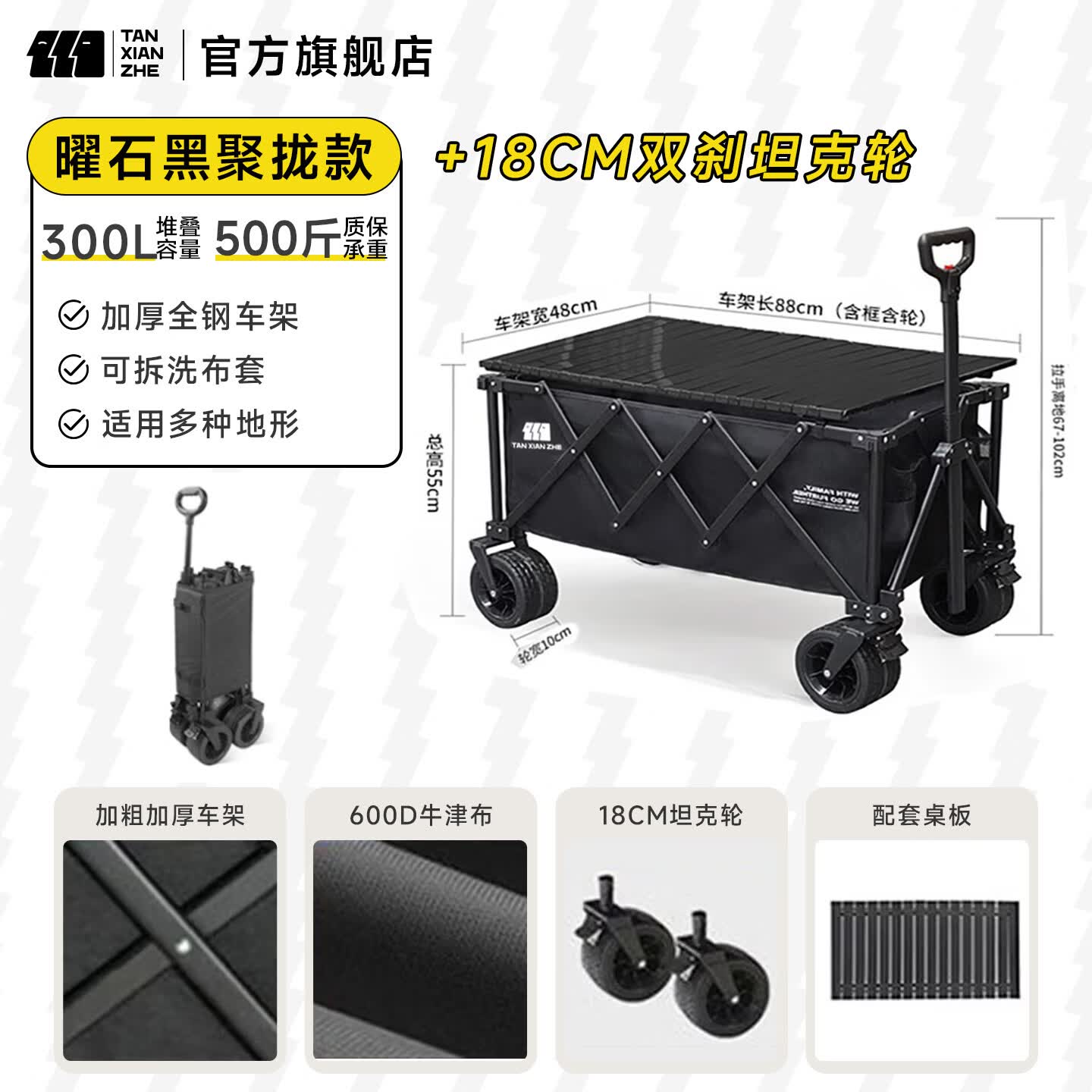 探险者(TAN XIAN ZHE)露营车儿童可躺户外推车野餐车露营装备折叠露营推车营地车买菜车 300L 聚拢曜石黑【坦克轮+桌板】