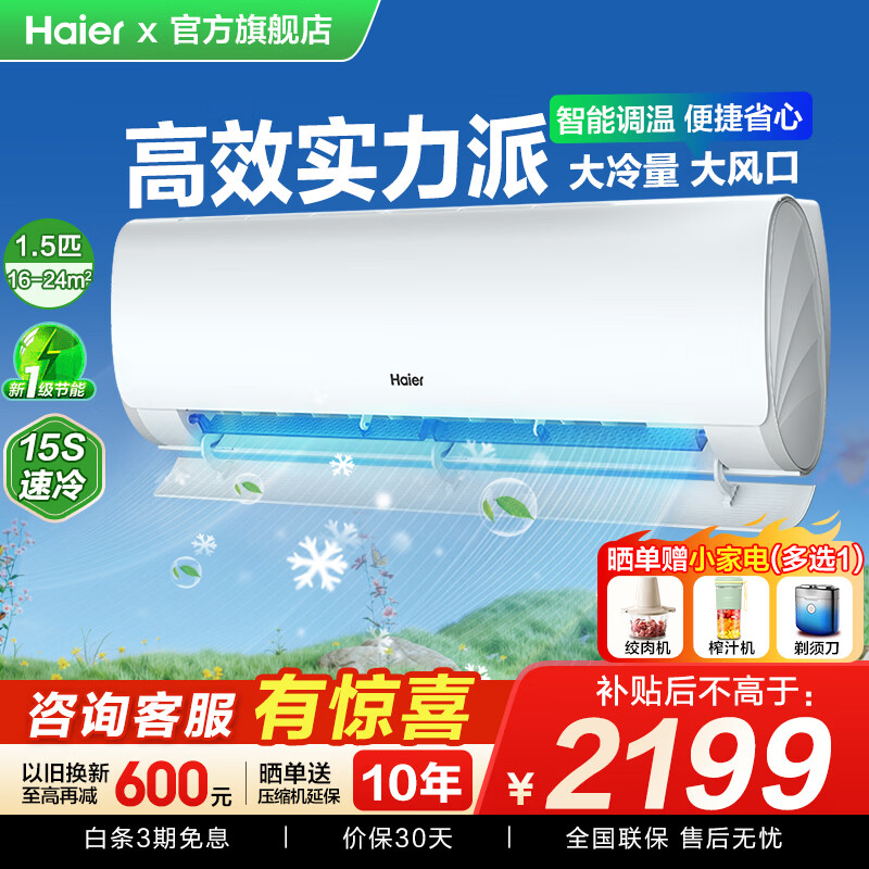 海尔空调1.5匹挂机变频一级能效 小红花系 冷暖独立除湿自清洁WIFI智控静音防直吹家用壁挂式卧室空调 1.5匹 一级能效【智能无风感】WiFi智控